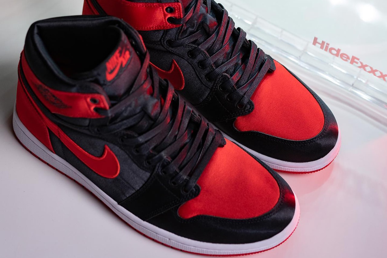 We now got our first glimpse at the eagerly anticipated pair of Air Jordan 1 "Satin Bred" sneakers following rumours that they would be returning in women's sizes. The red-on-black presentation of the original "Bred" hue is maintained in the remake, which has a luxurious satin upper. Release is still planned for October 18 and will cost $180 USD through Nike SNKRS and a few other stores.