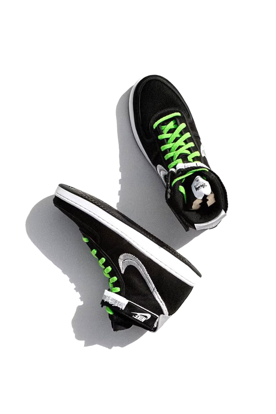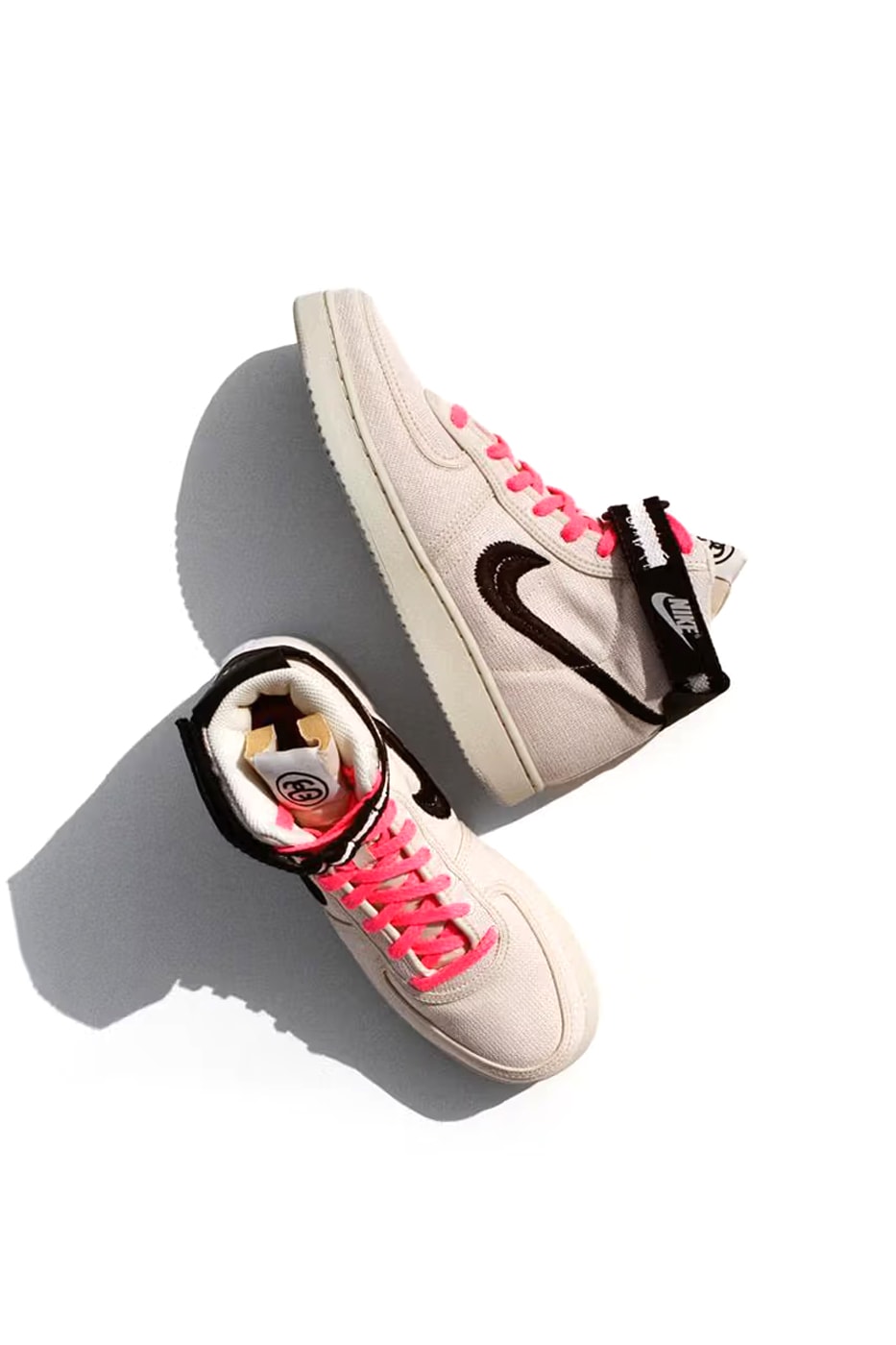 Along with its "Royal Blue" version, Stüssy and Nike have developed looks in "Fossil" and "Black." The three pairs each have a Stüssy-inspired finish and feature hemp uppers and embroidered Swooshes. Two additional coloured laces have also been added for each pair, along with previously unseen special hook-and-loop ankle straps, to offer even more detail. Ultimately, each of the three features distinctive co-branding at the tongue tab that pays homage to a variety of vintage Stüssy motifs.