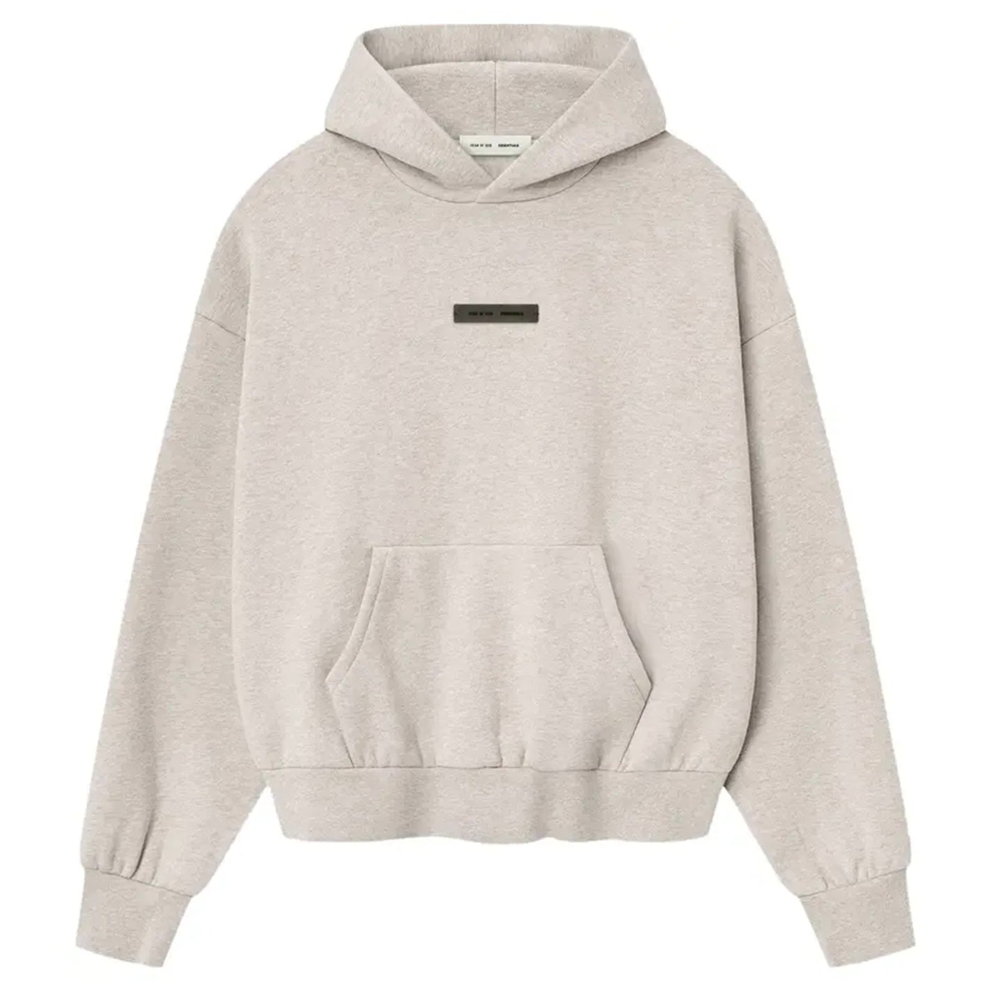 Crafted from a soft cotton-blend fleece, the hoodie delivers a plush hand-feel and a structured drape, ensuring warmth without bulk. The neutral Heather Stone tone offers a versatile palette that pairs effortlessly with any fit. Signature ESSENTIALS branding is printed across the chest and complemented by the tonal rubberized label at the hood — subtle yet unmistakably Fear of God.