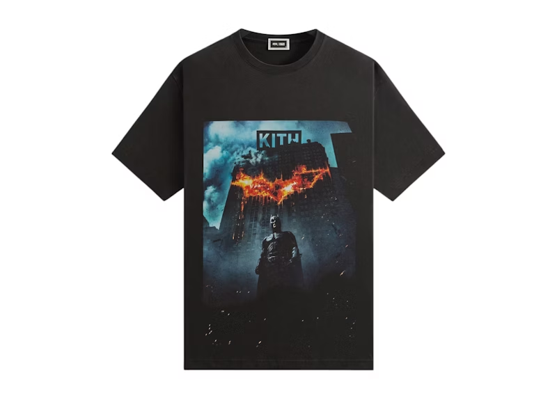 Crafted from heavyweight cotton with a vintage-washed finish, the tee delivers a soft, worn-in feel that complements its moody black base. The front features a powerful image of Batman set against a burning skyline with the legendary bat symbol ignited above — complete with subtle Kith branding integrated into the design.
