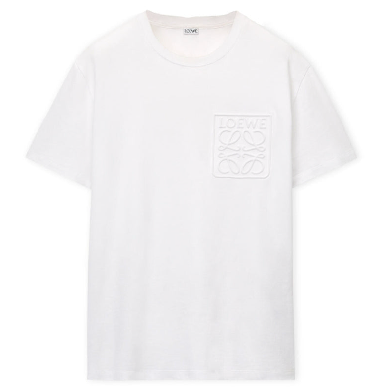 The focal point is the debossed Loewe Anagram logo at the chest with a refined, tonal detail that delivers textured depth without overpowering the shirt’s understated aesthetic. The crisp white base ensures effortless styling across seasons, making it a versatile foundation piece for both casual and elevated looks.