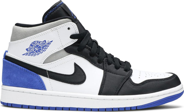 Using distinctive colour schemes and construction materials, the Air Jordan 1 Mid SE 'Royal Black Toe' modernises a timeless design. White leather serves as the foundation of the upper, which also has a blue suede heel and black nylon contrasts on the eyestay, Swoosh, and forefoot overlay. On the lateral collar flap, Jordan Brand's vintage Wings emblem is imprinted, and the woven tongue tag has a Jumpman icon. A full-length foam midsole with added Nike Air cushioning in the heel supports the mid-top. Cop this exclusive Air Jordan 1 Mid at Hype Vault, Asia's top trusted high-end streetwear and sneakers store.