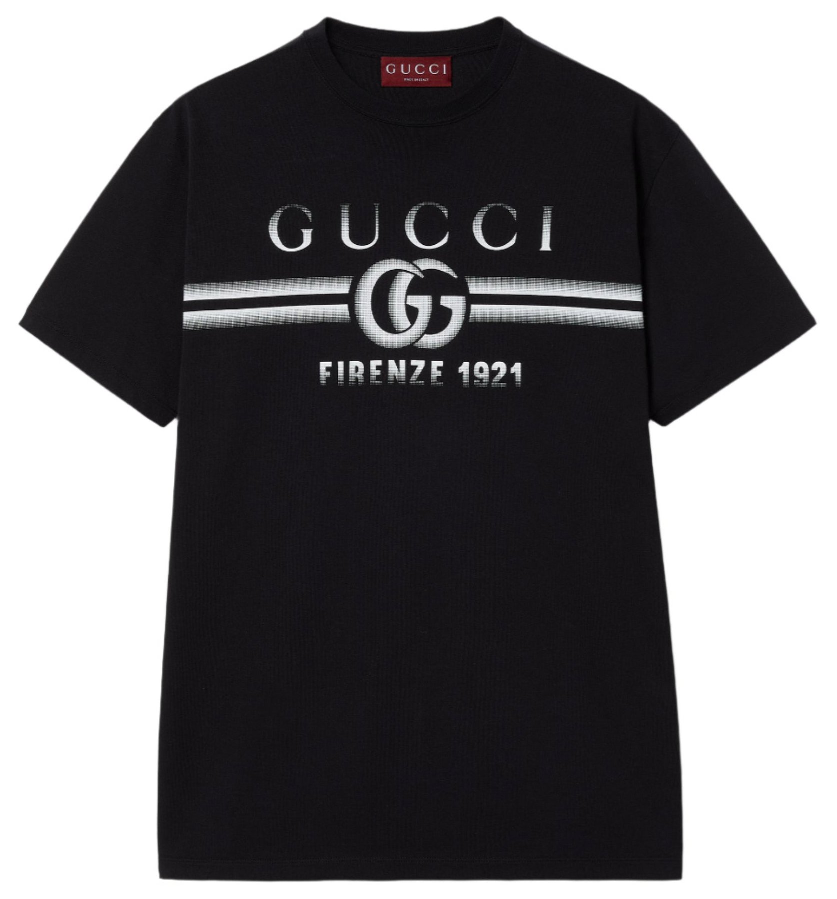 Channeling the vibrant energy of summer and the charm of Italian beach clubs, this piece is part of the Gucci Lido collection. Crafted from black cotton jersey, the T-shirt features a vintage-style faded "Gucci Double G Firenze 1921" print, adding a nostalgic yet elevated touch to its laid-back silhouette.