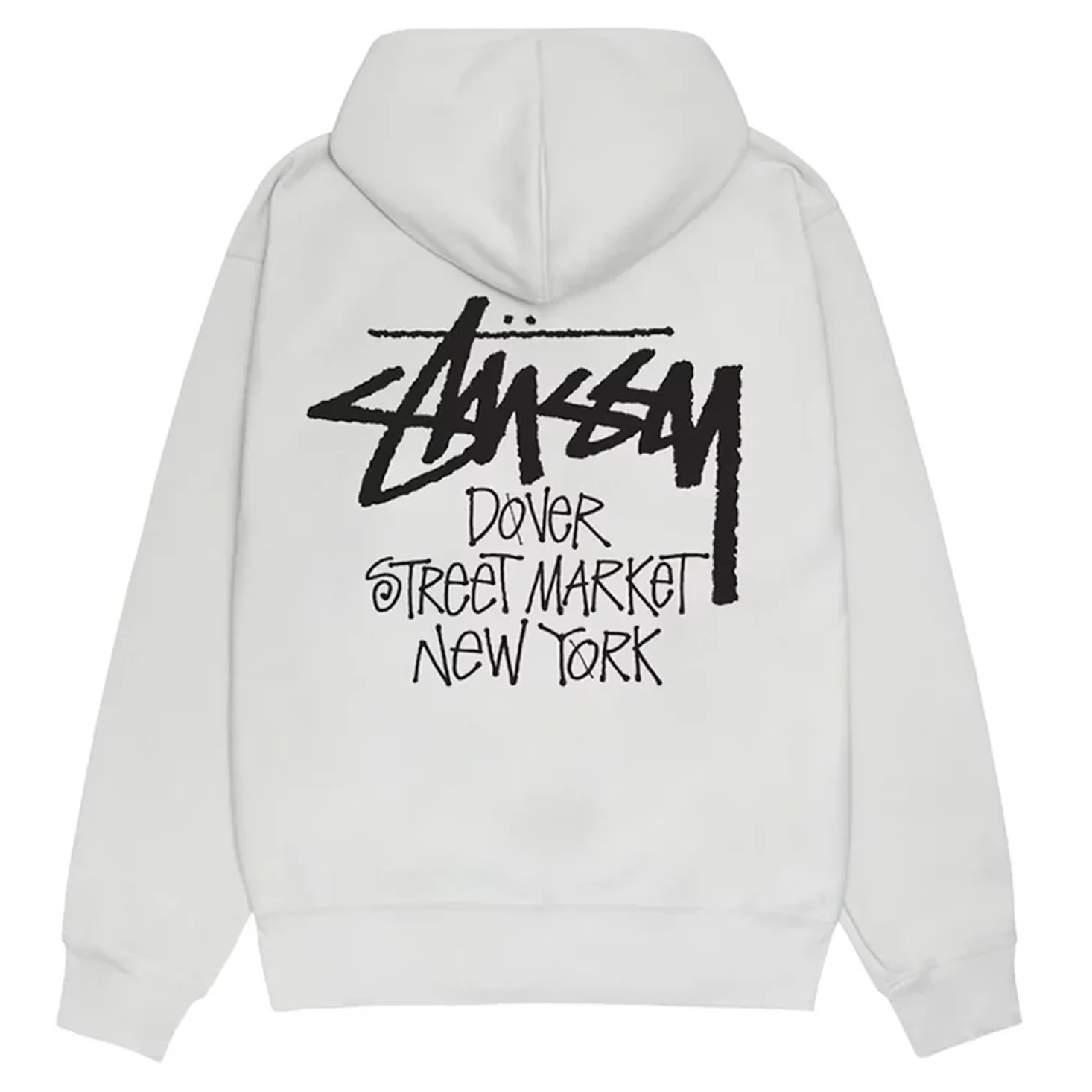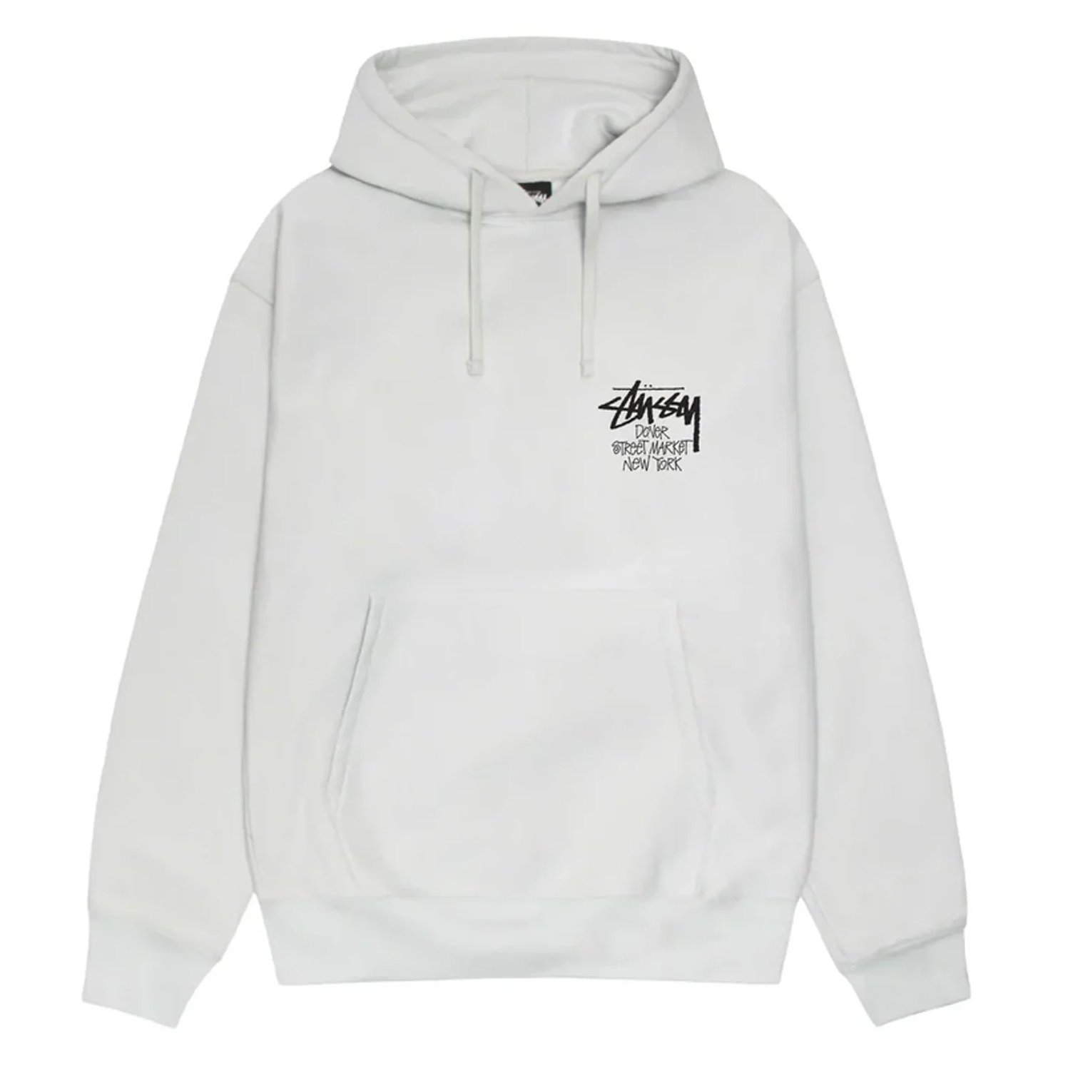 The clean Ash Heather base is elevated by dual branding with the classic Stüssy script and the distinctive Dover Street Market New York logo. It creates a unique statement piece that’s both subtle and striking. Finished with ribbed cuffs, a roomy kangaroo pocket, and an adjustable hood, this hoodie balances function with cultural flair.